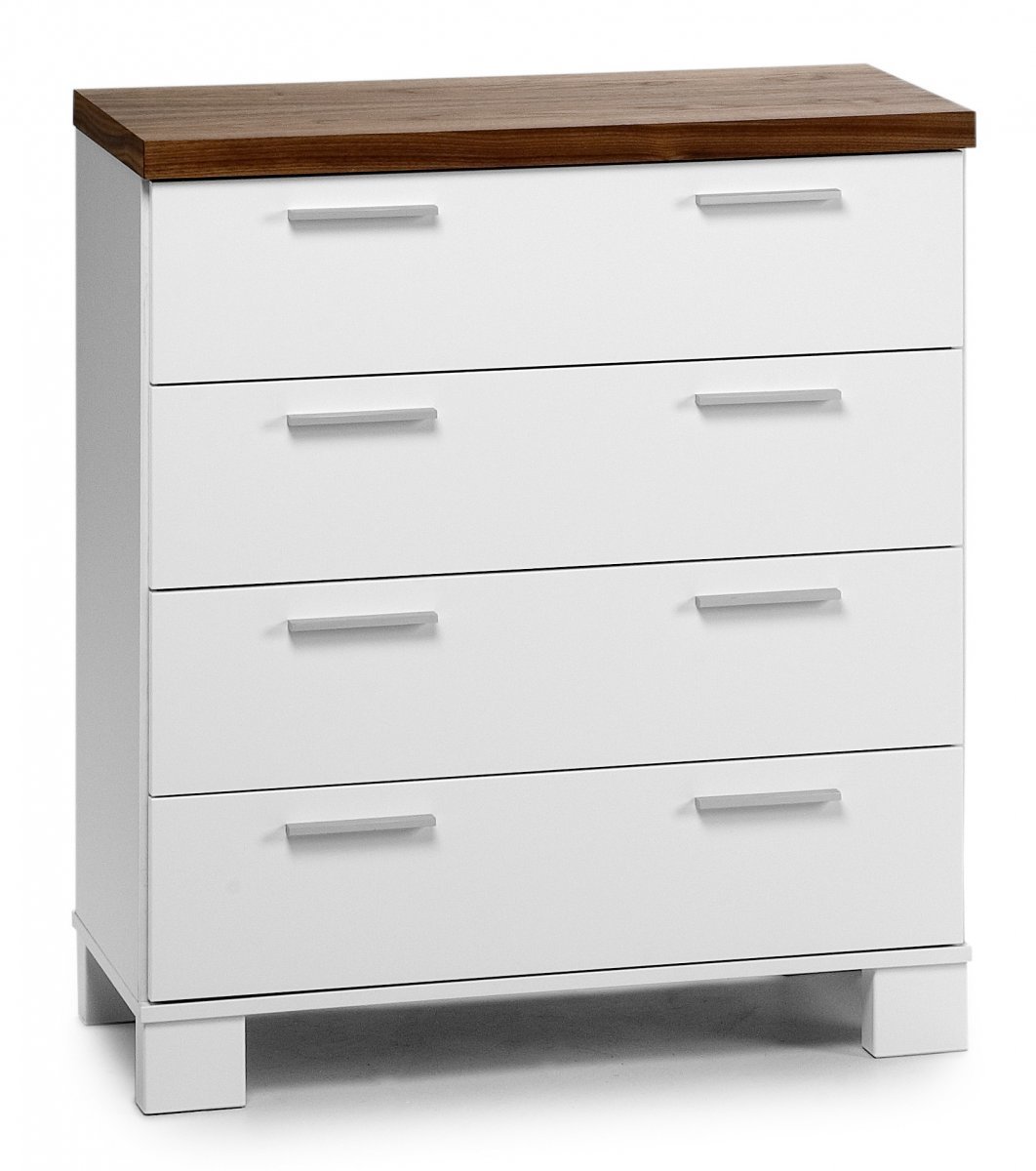 Suomessa valmistetussa, valkoisessa Aamu-lipastossa (80 cm) on pähkinänvärinen kansi ja 4 vetolaatikkoa. Metallivetimet. Tutustu Aamu-huonekaluihin!