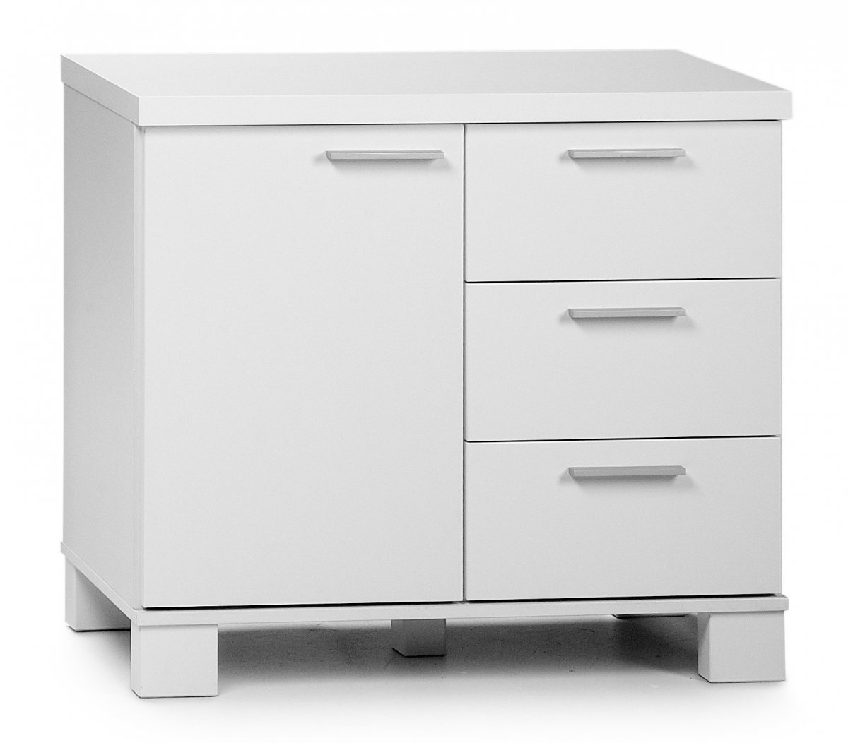 Suomessa valmistetussa, Aamu-lipastokaapissa (80 cm) on kaappi, 3 vetolaatikkoa ja valkoinen kansiosa. Tilaa Aamu-huonekalut Hobby Hallista!