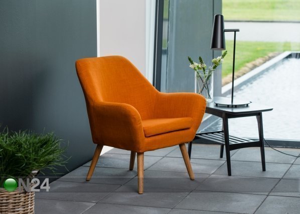Nojatuoli on verhoiltu oranssilla (Rio fabric orange 120) kankaalla – runko on valmistettu… Lue lisää »