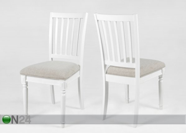 Antiikkisen tyylisten tuolien istuimet on verhoiltu beigellä kankaalla – tuolien puurunko on lakattu… Lue lisää »