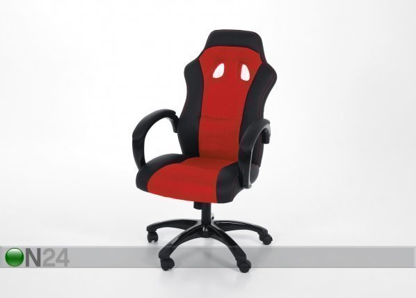 Tuolin istuintyyny ja selkänoja on verhoiltu mustalla keinonahalla ja punaisella verkkokankaalla – tuolissa… Lue lisää »