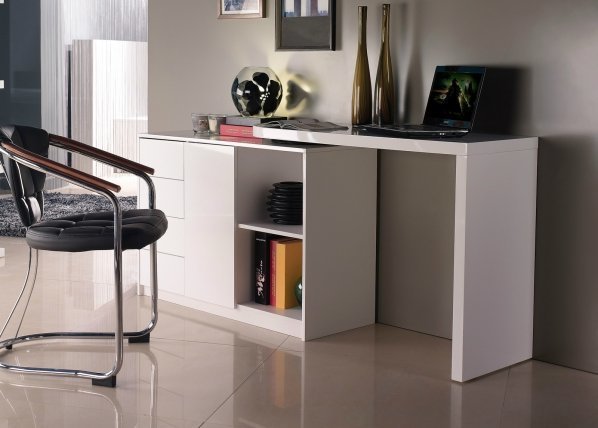 Valkoinen, korkeakiiltoinen tietokonepöytä on valmistettu MDF -kalustelevystä – kansi on käännettävä – kolme… Lue lisää »