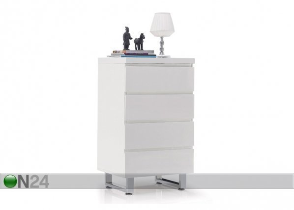 Valkoinen, korkeakiiltoinen lipasto on valmistettu mdf-kalustelevystä – neljä metallikiskoilla liukuvaa laatikkoa – kromijalat… Lue lisää »
