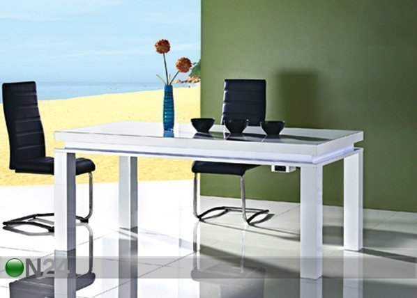 Valkoinen, korkeakiiltoinen ruokapöytä on valmistettu mdf-kalustelevystä – kannen alla oli välipaneeli, jota valaisee… Lue lisää »