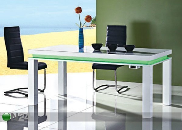 Valkoinen, korkeakiiltoinen ruokapöytä on valmistettu mdf-kalustelevystä – kromijalat – toimitukseen sisältyy RGB-ohjain LED-valoa… Lue lisää »