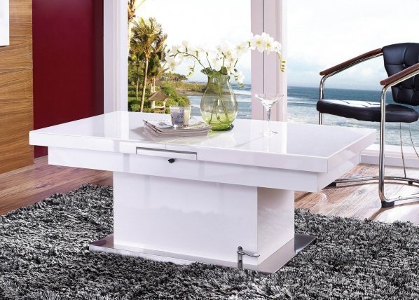 Sohvapöytä/ruokapöytä on valmistettu valkoisesta korkeakiiltoisesta MDF -kalustelevystä – alemmassa asennossa pöytää voi käyttää… Lue lisää »