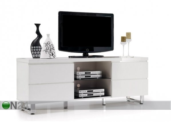 Valkoinen, korkeakiiltoinen tv-taso on valmistettu mdf-kalustelevystä – neljä metallikiskoilla liukuvaa laatikkoa – tv-tason… Lue lisää »