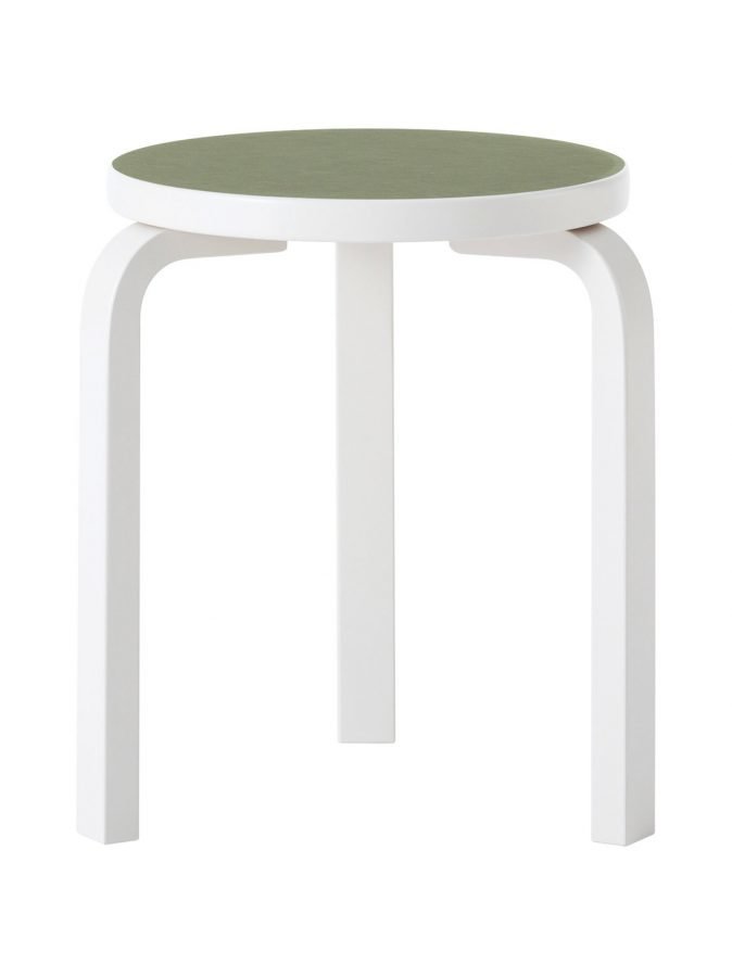 Alvar Aallon vuonna 1933 suunnitteleman, pinottavan klassikon kolme jalkaa ovat maalattua koivua ja istuinosa oliivinvihreää linoleumia. Toimitetaan osina. Halkaisija 38 cm, korkeus 44 cm.