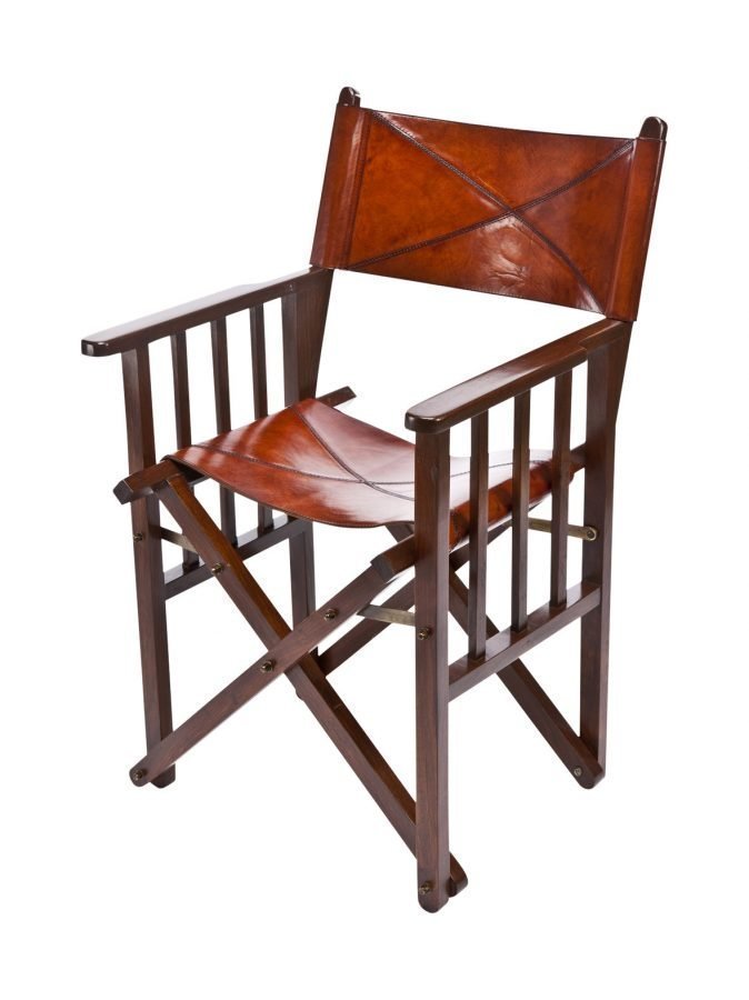 Tyylikäs ohjaajantuoli on puhvelinnahkaa ja puuta. Tuolin voi taittaa kasaan. Mitat 55 x 45 cm.