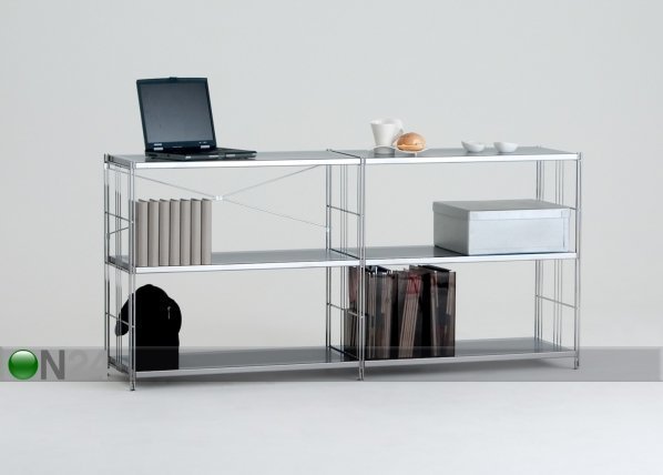 Kromatusta teräksestä valmistettu moderni kirjahylly – sileäpintaiset hyllyt (hyllytasoissa pienet reiät) – hyllyjen… Lue lisää »