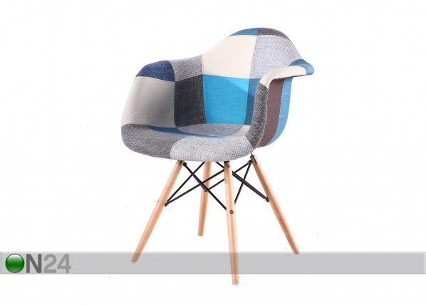 Muovi-istuin on verhoiltu tilkkuteknikalla, sinisen sävyisiä kankaita – runko on metallia ja jalat… Lue lisää »