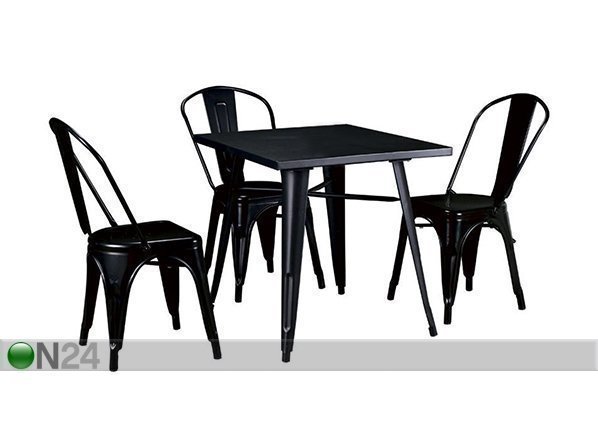Ruokailuryhmään sisältyy ruokapöytä ja neljä tuolia – valmistettu maalatusta metallista – väri: musta… Lue lisää »