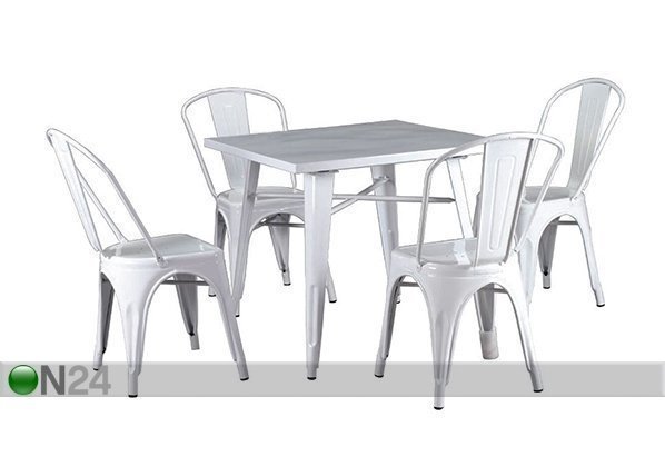 Ruokailuryhmään sisältyy ruokapöytä ja neljä tuolia – valmistettu maalatusta metallista – väri: valkoinen… Lue lisää »