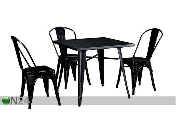 Ruokailuryhmään sisältyy ruokapöytä ja neljä tuolia – valmistettu maalatusta metallista – väri: musta… Lue lisää »