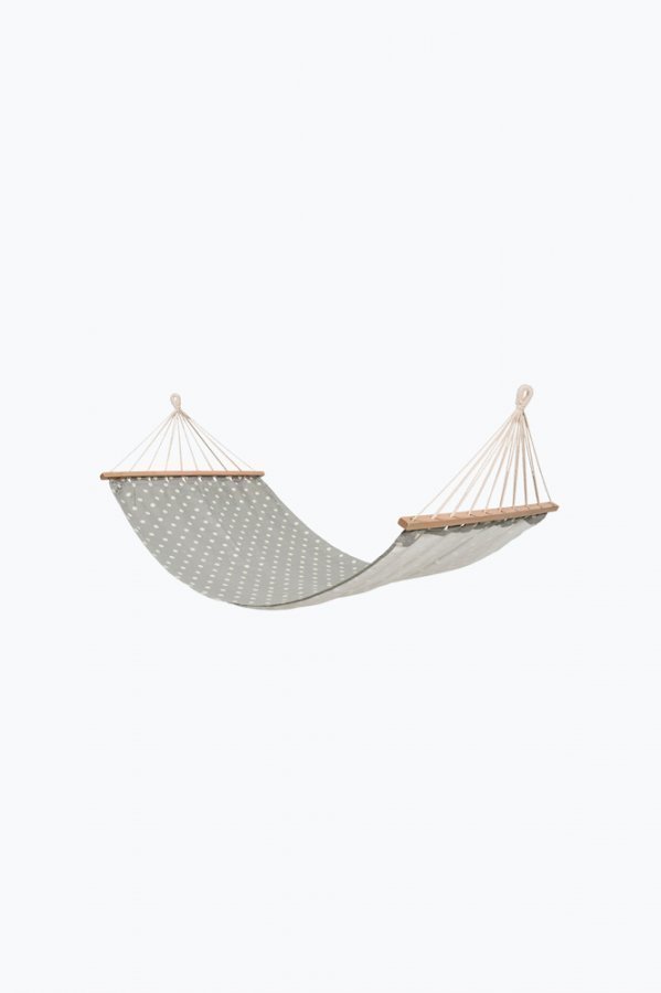 Riippumatto harmaata kanvaasia, jossa valkoisia pilkkuja. P200xL100 cm. Enimmäiskäyttöpaino 120 kg.
