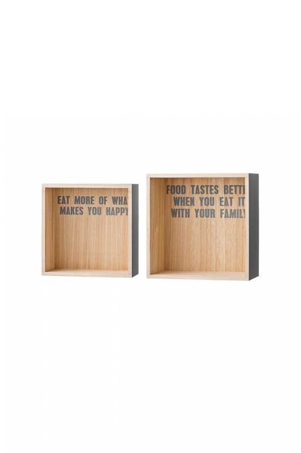 Kaksi puista hyllyä, joissa teksti. Leveys 28 cm x halkaisija 12 cm x korkeus 28 cm/Leveys 21 cm x syvyys 15 cm x korkeus 32 cm.