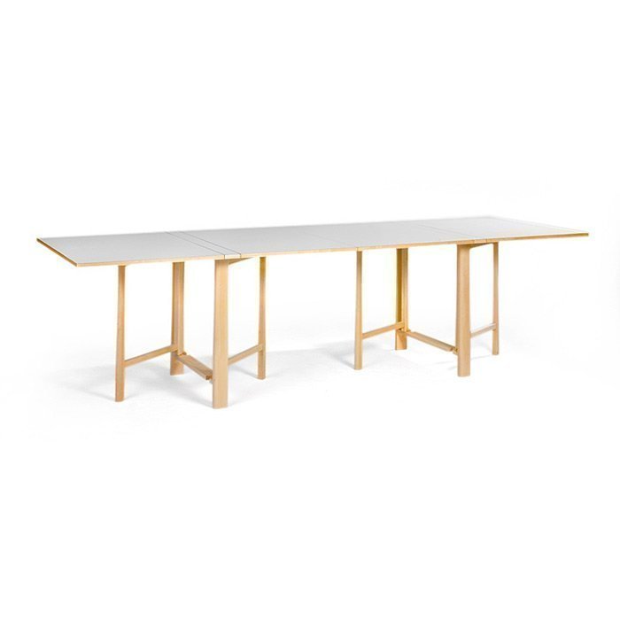 Bruno Mathssonin kokoontaitettava pöytä, joka voidaan taittaa 23cm-280cm. Pöytä on valkoista laminaattia, runko massiivikoivua.