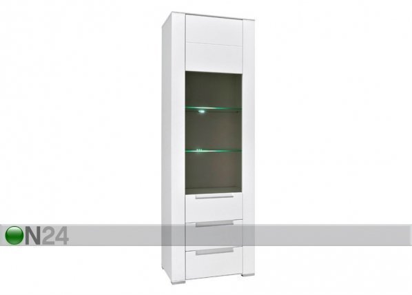 Vitriinikaappi on valmistettu laminoidusta kalustelevystä – oven takana on kaksi lasihyllyä ja kaksi… Lue lisää »