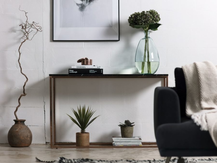 Marmoripöytä elegantin minimalistisella muotoilulla. Tässä apupöydässä on musta marmorilevy ja vankka kehikko kuparipinnoitettua terästä, yhdistelmä… Lue lisää »