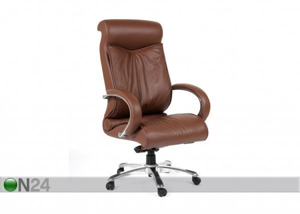 Työtuolin istuin ja selkänoja on verhoiltu ruskealla nahalla – käsinojat ovat metallia, verhoiltu… Lue lisää »