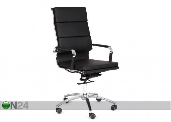 Työtuolin istuintyyny ja selkänoja on verhoiltu mustalla eko-nahalla – käsinojat ovat metallia, verhoiltu… Lue lisää »