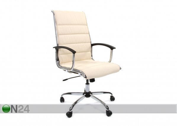 Työtuolin istuintyyny ja selkänoja on verhoiltu beigellä eko-nahalla – käsinojat ovat metallia ja… Lue lisää »