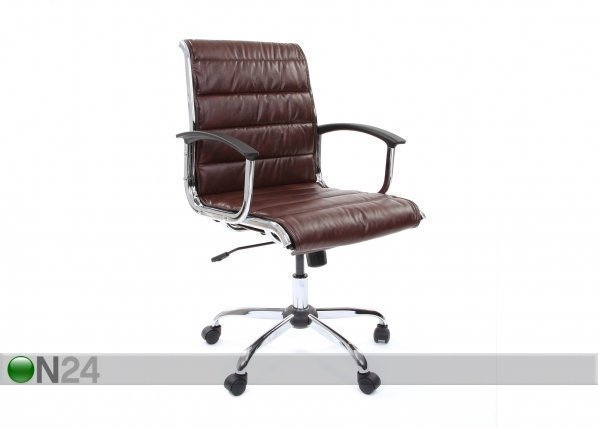 Työtuolin istuin ja selkänoja on verhoiltu ruskealla eko-nahalla – käsinojat ovat metallia, verhoiltu… Lue lisää »