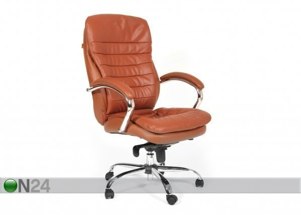 Työtuolin istuin ja selkänoja on verhoiltu ruskealla nahalla – käsinojat ovat metallia, verhoiltu… Lue lisää »