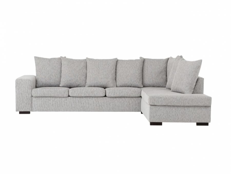 Vaaleanharmaa L-sohva siroilla tyynyillä. Valitse avoin pääty joko oikealle tai vasemmalle. Mitat: L298 S90/193 K88… Lue lisää »