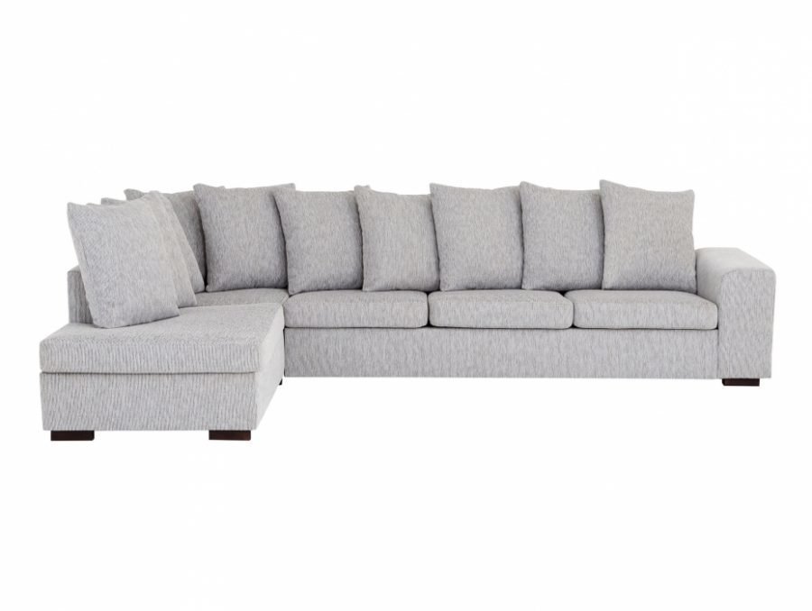 Vaaleanharmaa L-sohva siroilla tyynyillä. Valitse avoin pääty joko oikealle tai vasemmalle. Mitat: L328 S90/193 K88… Lue lisää »