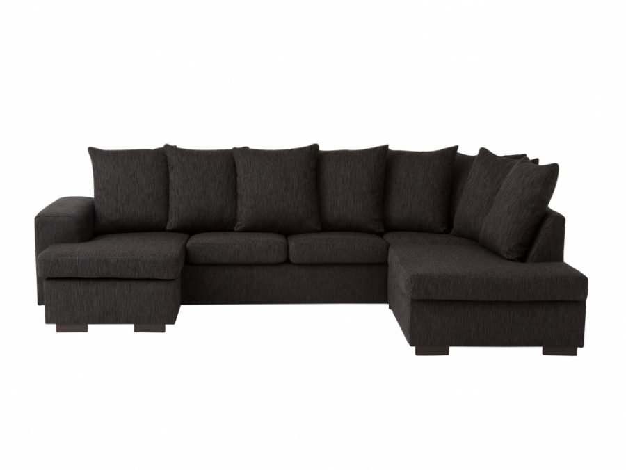 Musta U-sohva koristetyynyillä, valitse joko oikean- tai vasemmanpuoleinen avoin pääty. Mitat: L298 S153/193 K88 cm…. Lue lisää »