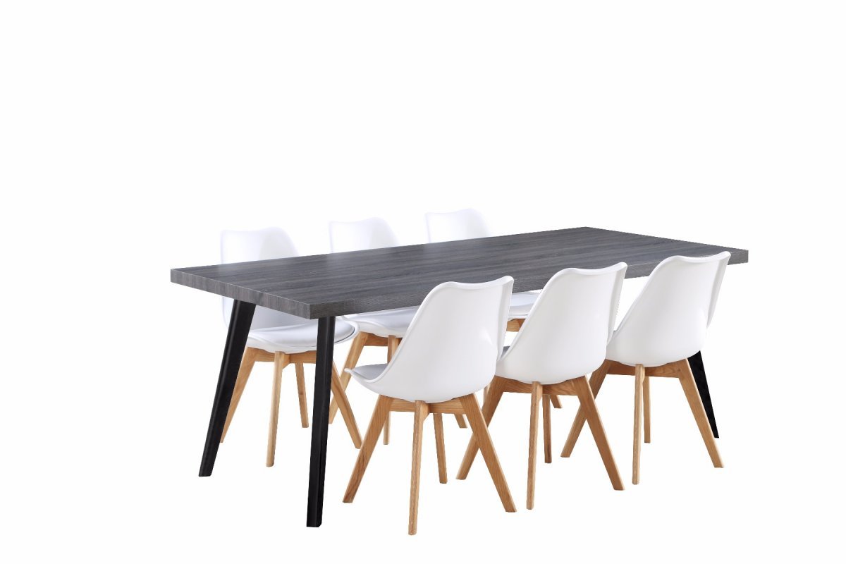 Moderni Chicago-ruokaryhmä: tumma pöytä, 6 valkoista tuolia. Pöydässä on non-stick-pinta ja metallijalat. Tuolien istuinosa on vahvaa muovia. Eri kokoja!