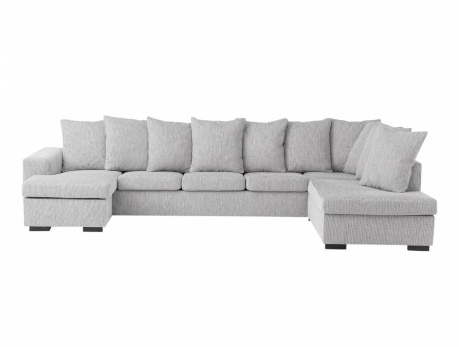 Vaaleanharmaa U-Sohva koristetyynyillä, valitse joko oikean- tai vasemmanpuoleinen avoin pääty. Mitat: L358 S153/193 K88 cm…. Lue lisää »