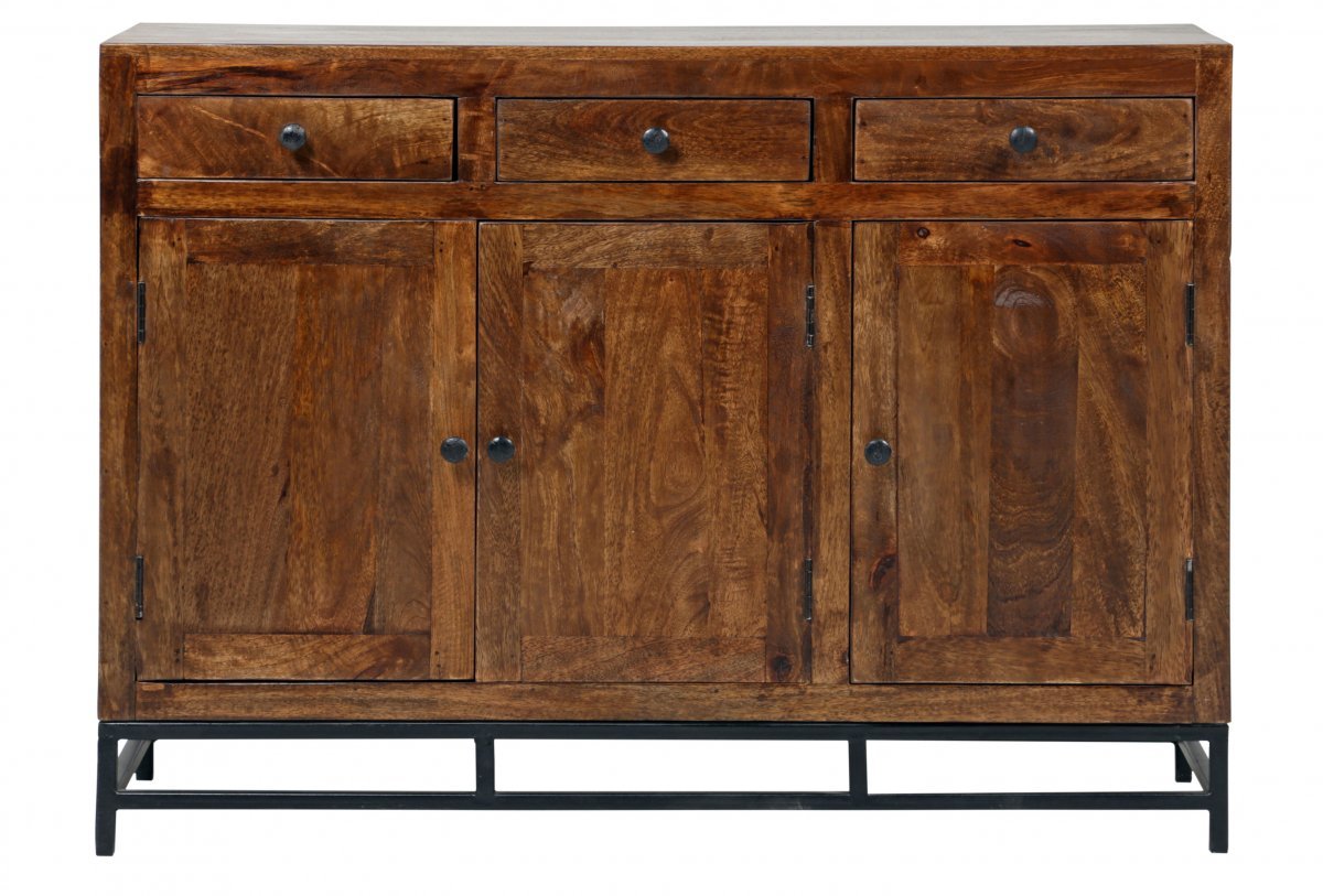 Colonial-senkki on valmistettu käsityönä mangopuusta. Sokkeli ja jalat metallia. 3 laatikkoa ja 3 kaappia. Ostoksille!