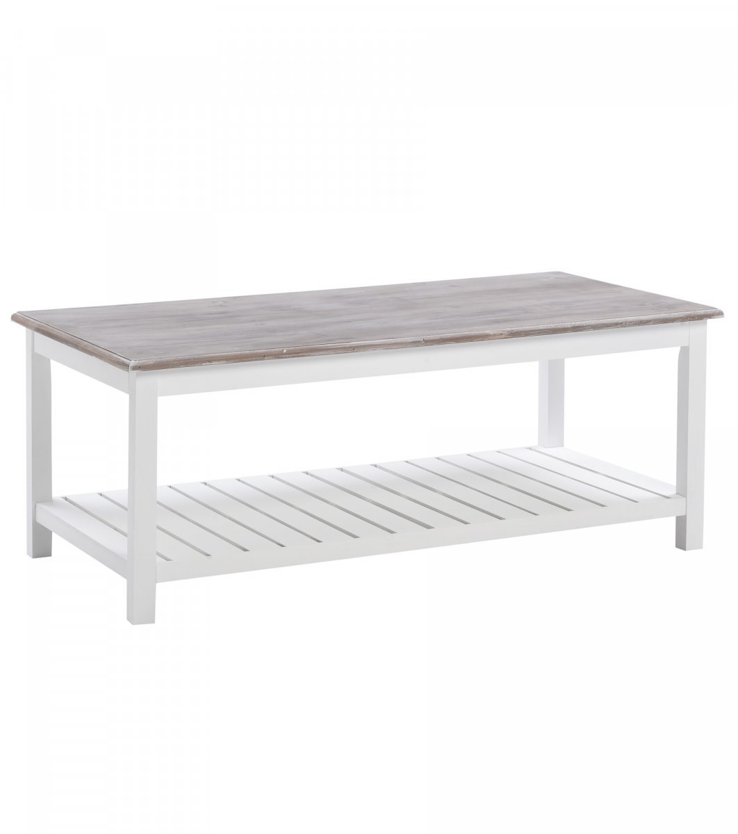 Country-sohvapöytä henkii maalaisromantiikkaa. Valkoisessa pöydässä on harmaaksi petsattu, lakattu pöytätaso + valkoinen ritilämäinen alataso. Tutustu!