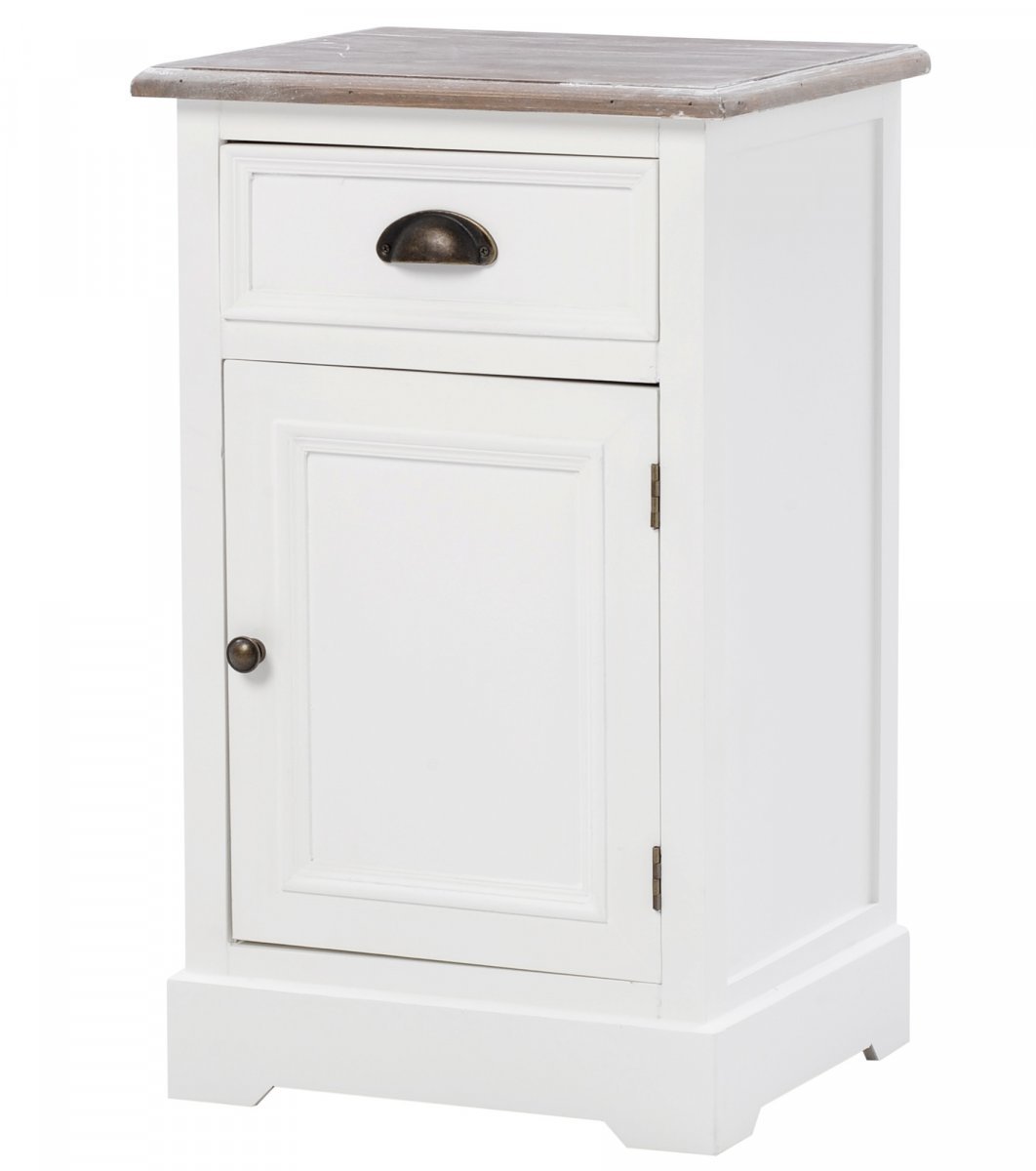 Country-yöpöytä henkii maalaisromantiikkaa. Vaaleassa, oikealle avautuvassa yöpöydässä on harmaaksi petsattu, lakattu kansiosa, laatikko + kaappi. Tutustu!