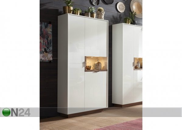 Kolmiovinen kaappi on valmistettu kalustelevystä – etupaneeleissa on korkeakiilto – vasemmanpuolisen korkean oven… Lue lisää »