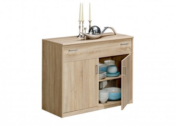 Fooliumpinnoitetusta kalustelevystä valmistetussa lipastossa on laatikko ja ovet – ovien takana on yksi… Lue lisää »