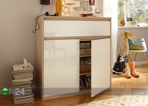 Kalustelevystä valmistetussa lipastossa on yksi laatikko ja kaksi ovea, etupaneeleissa on korkeakillto -… Lue lisää »