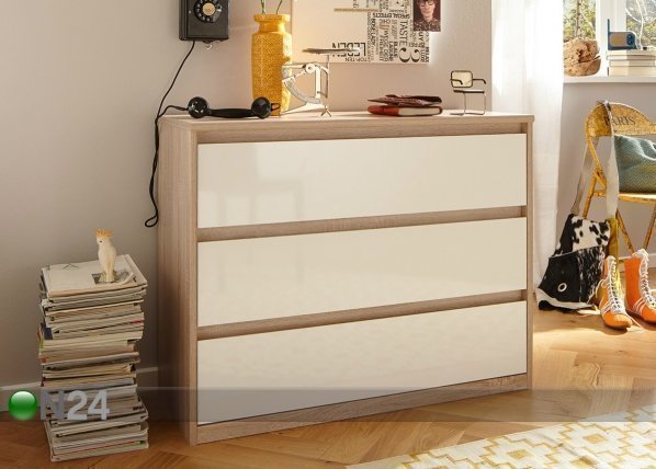 Kalustelevystä valmistetussa lipastossa on kolme laatikkoa, etupaneeleissa on korkeakiilto – laatikot liukuvat metallikiskoilla… Lue lisää »