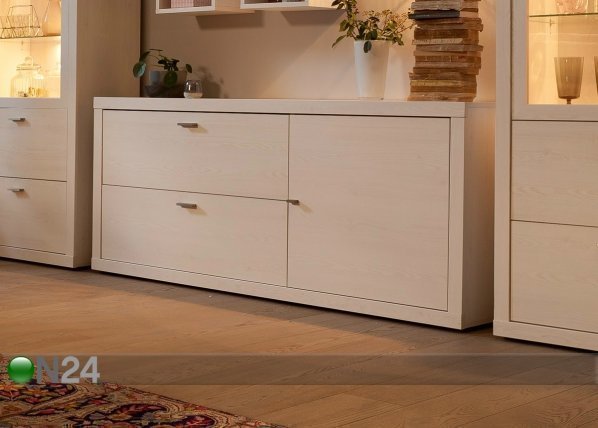 Kalustelevystä valmistetussa lipastossa on yksi ovi ja kaksi laatikkoa – oven takana on… Lue lisää »