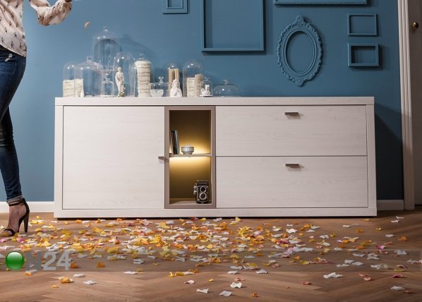 Kalustelevystä valmistetussa lipastossa on yksi ovi ja kaksi laatikkoa – oven takana on… Lue lisää »