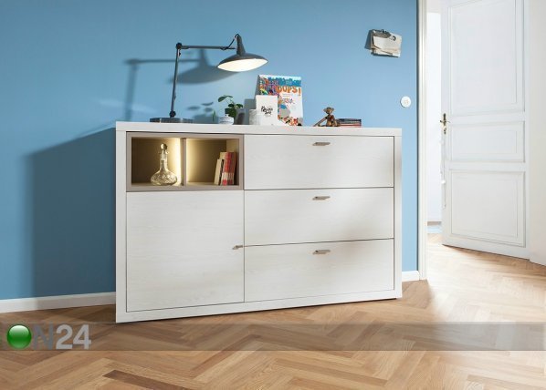 Kalustelevystä valmistetussa lipastossa on yksi ovi ja kolme laatikkoa – oven takana on… Lue lisää »