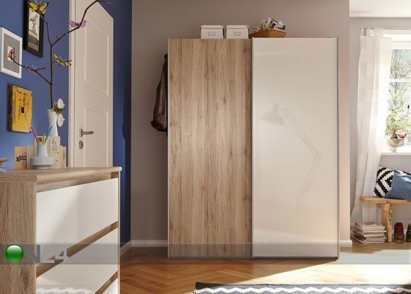 Liukuovinen vaatekaappi on valmistettu kalustelevystä – valkoisessa ovessa on korkeakiilto – ovien takana… Lue lisää »