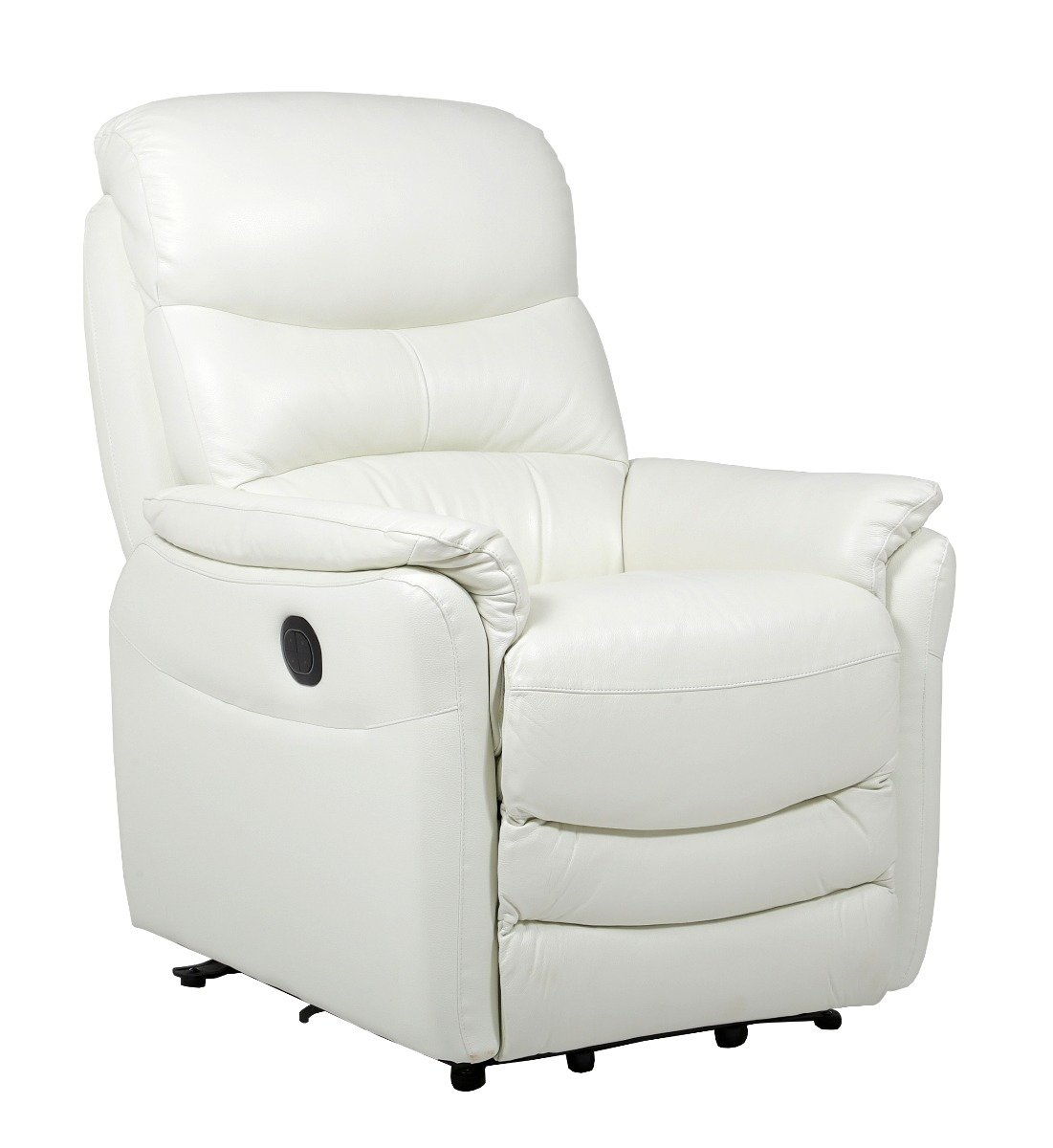 Valkoinen Dallas recliner -tuoli on nahkaa. Sähkömekanismilla säädettävä selkänojan kallistus + jalkatuen nosto. Lue lisää ja tilaa!