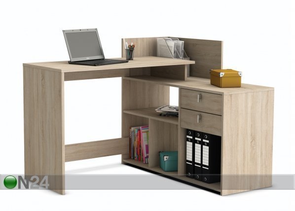 Kulmapöydässä on korkeampi pöytäosa ja matalampi hyllyosa, jossa välihylly ja kaksi metallikiskoilla liukuvaa… Lue lisää »