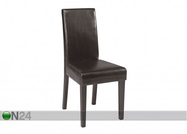 Ruokailuhuoneen tuolin istuin ja selkänoja on verhoiltu ruskealla keinonahalla, vaaleat kontrastiompeleet – tuolin… Lue lisää »