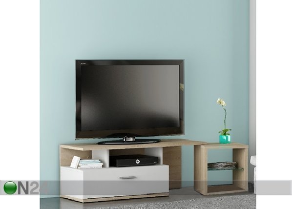 Tv-tasossa on laatikko, säilytystila ja irrotettava kaappiosa – oikealla oleva kaappiosa lasihyllyllä on… Lue lisää »