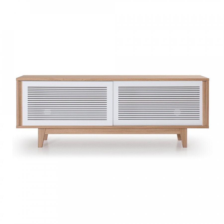 Line TV-taso on moderni ja tyylikäs taso, joka on valmistettu luonnollisista materiaaleista ja väreistä. Edessä liukuovet ja sisällä kaksi säädettävää hyllyä. Huonekalu toimitetaan koottuna.