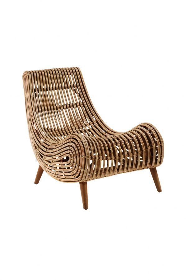 Käsinojallinen tuoli luonnonväristä rottinkia. Jalat mahonkia. Korkeus: 78 cm Leveys: 74 cm Syvyys: 94 cm